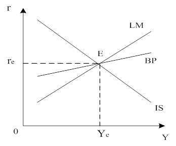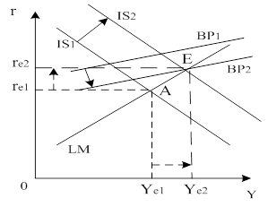 Если страна проповедует политику гибкого валютного курса, то в этом случае курс национальной валюты падает и кривая платежного баланса (ВР) смещается вниз. Падение курса национальной валюты одновременно вызывает изменение условий внешней торговли, стимулируя экспорт товаров и услуг и сокращая импорт. Данное изменение стимулирует рост национальной экономики, что отражается в сдвиге кривой инвестиции-сбережения (IS) вверх. Рост объема производства означает рост доходов субъектов и повышение совокупного спроса, для чего требуются дополнительные деньги, то есть растет спрос на деньги, провоцируя повышения ставки процента. Эти изменения будут происходить до тех пор, пока не сформируется равновесие на всех трех рынках при большем объеме производства и более высокой ставке процента (точка Е) (7, c. 107).