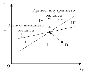 Одновременное достижение экономикой внутреннего равновесия и внешнего равновесия может быть описано с помощью модели Р. Манделла. В качестве независимых инструментов экономической политики используются уровень государственных расходов (G), как инструмент фискальной политики, и уровень ставки процента (r), как инструмент кредитно-денежной политики. Предположим, что экономика первоначально находится в точке равновесия (точка А на рис. 1.4) (7, c. 108).