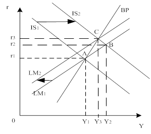 Предположим, что для этой цели оно приняло решение повысить таможенные пошлины на импорт. Это приведет к сокращению импорта и росту чистого экспорта. Покупатели начинают переключаться на покупку отечественных товаров вместо импортных и это вызывает рост совокупного спроса, что отражается в сдвиге кривой IS вправо, вызывая рост объема производства до Y2. Одновременно растет ставка процента, так как растет спрос на деньги для оплаты товаров, вложения инвестиций и т.д. Данные процессы вызывают изменения текущего счета и счета движения капитала платежного баланса в одном направлении, то есть возникает положительное сальдо (точка В ниже кривой ВР1). Активное сальдо вызывает рост спроса на национальную валюту, что провоцирует рост валютного курса. Чтобы этого не допустить Центральный банк должен проводить валютные интервенции по покупке иностранной валюты, увеличивая тем самым количество денег в стране и снижая ставку процента (кривая LM сдвигается вправо). Это еще в большей мере стимулирует рост объема производства в стране. Так как объем производства сказался на состоянии текущего счета, а снижение ставки процента на состоянии счета движения капитала, то платежный баланс придет в равновесное состояние и экономика окажется в точке С, характеризующей внутреннее и внешнее равновесие экономики.