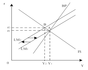 Центральный банк страны продает ценные бумаги хозяйствующим субъектам, тем самым сокращая количество денег в стране. Кривая LM будет сдвигаться вверх. В результате этого ставка процента растет, что вызывает сокращение объема инвестиций и объема производства. Рост ставки процента вызывает приток иностранного капитала и сокращение импорта. В результате этих процессов растет положительное сальдо платежного баланса (кривая ВР находится ниже точки В, характеризующей внутреннее равновесие). Данные процессы вызывают тенденцию к росту курса национальной валюты. Но так как в стране политика фиксированного валютного курса, то Центральный банк должен проводить валютные интервенции по покупке иностранной валюты, увеличивая тем самым количество денег в стране. Это приведет к снижению ставки процента, росту объема инвестиций, объема производства и через некоторое время экономика окажется в исходном состоянии. Таким образом, кредитно-денежная политика при фиксированном валютном курсе оказывается неэффективной, так как попытки воздействовать на денежную массу в стране для решения внутренних проблем наталкиваются на необходимость проведения противоположных действий для поддержки валютного курса. Выходом из этой ситуации является политика стерилизации или изменение курса национальной валюты (девальвация или ревальвация) (7, c. 110).