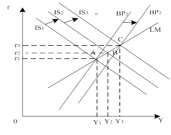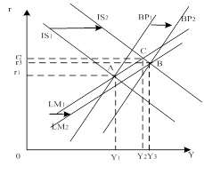 Так как ставка процента на рынке денег снизится, то это приведет к оттоку капитала из страны, что увеличит дефицит счета движения капитала платежного баланса. Рост доходов в экономике вызовет рост импорта, что приведет к образованию дефицита торгового баланса и увеличит отрицательное сальдо платежного баланса. В условиях плавающих курсов такая ситуация провоцирует снижение курса национальной валюты. Центральный банк в данный процесс вмешиваться не будет. Снижение курса вызовет удешевление отечественного экспорта и удорожание импорта и дальнейшее увеличение совокупного спроса и дохода. Кривые IS и ВР будут сдвигаться вправо до тех пор, пока все три кривых не пересекутся в точке С.