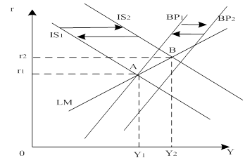 При отсутствии международной мобильности капитала рост государственных расходов оказывает воздействие на внешний баланс только через рост импорта, но более высокие ставки процента привлекают в страну иностранный капитал, что ведет к росту активного сальдо счета движения капитала. Но в силу низкой мобильности капитала приток будет незначительным и возникнет дефицит платежного баланса (точка В, характеризующая внутреннее равновесие, находится ниже кривой ВР).