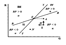 На рисунке 1.1 можно выделить четыре сектора, характеризующиеся определенным сочетанием состояний внешнего и внутреннего равновесия. Зона левее прямой Y соответствует дефициту платежного баланса (ВР < 0) и избыточному спросу, что сопровождается инфляцией (n). Зона II соответствует дефициту платежного баланса (ВР < 0) и избыточному предложению, которое сопряжено с безработицей (u). Зона III соответствует положительному сальдо платежного баланса (ВР > 0) и избыточному предложению (u). Наконец, зона IV указывает на положительное сальдо платежного баланса и избыточный спрос (π). На основе данного графика можно составить представление относительно правильного выбора направлений и инструментов экономической политики в целях приближения к полному равновесию (точка Е).