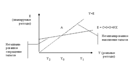 Линия планируемых расходов пересечет линию, на которой реальные и планируемые расходы равны друг другу (линию Y=E) в точке А. Этот график получил название крест Кейнса. На линии Y=E всегда соблюдается равенство планируемых и фактических инвестиций и сбережений. В точке А достигается это равенство, т.е. устанавливается макроэкономическое равновесие.