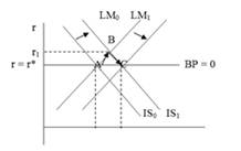 Фискальная политика. На рисунке 1.3 исходное равновесие находится на пересечении кривых IS0 и LM0 в точке А. Горизонтальная линия ВР = 0 означает внешнее равновесие. Это означает, что платежный баланс находится в равновесии (равен нулю). При совершенной мобильности капитала внутренняя и иностранная ставки процента должны быть равны (r = r*), иначе будут происходить чистые потоки капитала. Поэтому любая точка, не находящаяся на кривой ВР = 0 не может соответствовать ситуации, когда платежный баланс находится в равновесии, поскольку r не равна r*.