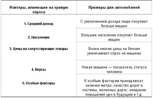 Табл. 2 – Факторы, влияющие на кривую спроса