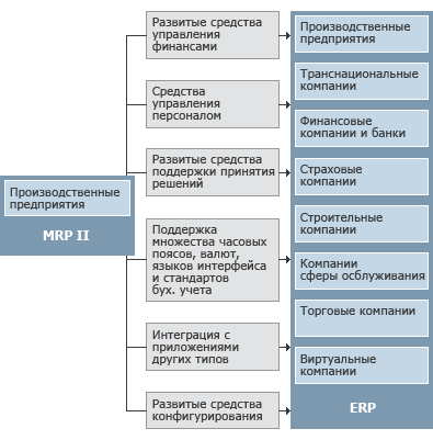 По сравнению с системами MRP II в системах ERP появились развитые средства управления финансами и персоналом, развитые средства поддержки принятия решений, средства конфигурирования и интеграции с приложениями других типов. В системах ERP появились механизмы управления, предназначенные не только для компаний, функционирующих в одной стране, но и для транснациональных корпораций, включая поддержку нескольких часовых поясов, языков, валют, систем бухгалтерского учета и отчетности.