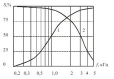 Зависимость слоговой разборчивости от частоты срезов фильтров, определяющих полосу частот пропускания канала связи показана на рисунке. Кривая 1 иллюстрирует зависимость слоговой разборчивости от значения частоты среза фильтра нижних частот (ФНЧ), пропускающего все частоты спектра сигнала ниже частоты среза. Кривая 2 характеризует аналогичную зависимость от значения частоты среза фильтра верхних частот (ФВЧ), пропускающего частоты спектра сигнала выше частоты среза. Из графика видно, что наибольший вклад в разборчивость речи обеспечивает полоса частот спектра сигнала от 300 до 3000 Гц.