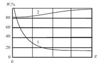 Разборчивость речи зависит от вида амплитудной характеристики канала связи (19). Зависимость разборчивости звуков W от порога ограничения "g" снизу (кривая 1) и сверху (кривая 2) показана на рисунке. Из кривой 1 видно, что даже небольшое ограничение в системе связи речевого процесса снизу вызывает резкое падение разборчивости, так как при таком ограничении теряются слабые звуки.