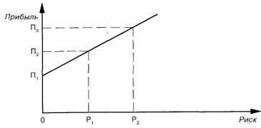 Из графика видно, что нулевой риск обеспечивает самый низкий доход (0; П1 ), а при самом высоком риске Р = Р2. прибыль имеет наиболее высокое значение П = П3 (П3 > П2 > П1).