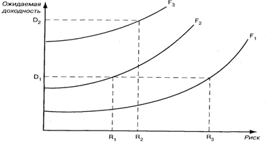 Кривые на карте предпочтений имеют положительный наклон, так как из сопоставляемых критериев один — позитивный, а другой — негативный. Изображенные на рисунке кривые носят название «кривых равных предпочтений» или «кривых безразличия», так как каждая из них отражает своими точками равнопредпочтимые для предпринимателя при данном уровне его удовлетворенности пары ожидаемой эффективности и рискованности решения. Приемлемых уровней удовлетворенности (полезности) может быть несколько. На приведенном рисунке их три, из них наиболее низкий из всех приемлемых уровень F1 наиболее высокий — F3 .Уровень F1 ниже, чем уровень F2 так как при одной и той же ожидаемой доходности решения в первом случае (для F1) величина риска R3 больше, чем риск R1 во втором случае (для F3). Сочетание же ожидаемой рентабельности решения и его рискованности, отвечающее одной из точек кривой равных предпочтений для уровня F3, оказывается тогда за счет более высокой ожидаемой доходности вложений в данное решение (хотя и при большем риске) боле привлекательным для предпринимателя, соответствует более высокому уровню полезности для него. Карта предпочтений предпринимателя должна быть построена для него либо им самим, либо с помощью сторонних экспертов построена эмпирически, то есть на основе обработки данных анализа решений, которые принимались ранее.