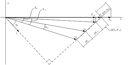 1) При расчёте запаса статической устойчивости при отсутствии АРВ генератор представляется в схеме замещения синхронным индуктивным сопротивлением по продольной оси Xd и приложенной за ним синхронной ЭДС Eq.