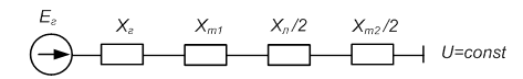 При выполнении расчётов устойчивости необходимо составить расчётную схему замещения электропередачи, которая составляется из схем замещения отдельных элементов. Элементы электропередачи представляются индуктивными сопротивлениями. Нагрузка представляется в комплексном виде. Элементы схемы замещения и параметры режима определяются в относительных единицах (о.е.). При этом за базисные величины рекомендуется принимать номинальную мощность генератора и напряжение на шинах нагрузки. Ряд величин оставляем в именованных единицах: время t(с), постоянные инерции Т(с), углы d(град) и j(град). Этим определяется форма записи уравнений движения, приводимых далее. При определении параметров будем использовать приближённое приведение по средним коэффициентам трансформации.