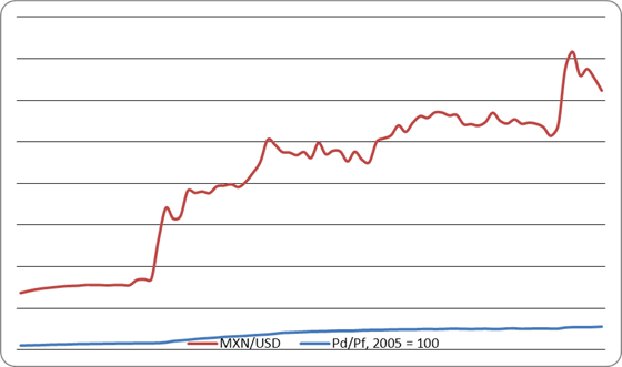Er= E*(Pf/Pd), где Er – реальный валютный курс мексиканского песо к доллару США, E – номинальный валютный курс, Pf – уровень цен в США, Pd – уровень цен в Мексике.