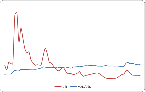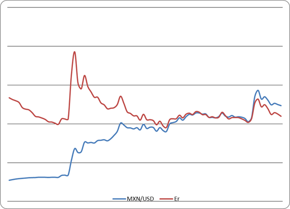 Рассматривая динамику данных показателей, можно заметить зависимость динамики валютного курса от динамики дифференциала процентных ставок в двух странах, что может объясняться сильной зависимостью экономики Мексики от США и иностранного капитала.