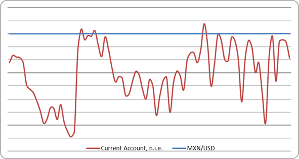Мексика – самая торгующая страна в Латинской Америке и одна из стран, имеющих наибольшее количество торговых соглашений. Торговый оборот страны постоянно растет, в частности за счет торговли внутри НАФТА. На протяжении рассматриваемого периода в Мексике наблюдался отрицательный счет по текущим операциям, за исключением небольшого профицита в 2004г. и в 1995г. за счет значительной девальвации валюты, после достижения минимального значения в кризисном 1994г.. В целом динамика счета по текущим операциям Мексики отличается значительными постоянными колебаниями, которые в полной мере не отражаются на изменении валютного курса.
