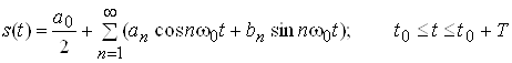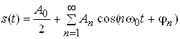 – кругова частота, що відповідає періоду повторення сигналу Т; частоти, кратні w0, що входять у формулу, називаються гармоніками;