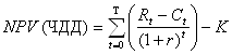1. Чистая текущая стоимость (NPV) или чистый дисконтированный доход (ЧДД). Чистая текущая стоимость характеризует эффект от реализации проекта, приведенный к начальному моменту времени. Если чистая текущая стоимость проекта положительна, это свидетельствует о наличии реального дохода от его реализации.