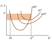Расстояние между линиями Р и АС представляет величину средней прибыли при выпуске Q единиц продукции. Прибыль достигает максимума при выпуске Q* единиц продукции. Обратим внимание на то, что при выпуске Q0 единиц предельные затраты тоже равны цене, но здесь не выполняется достаточное условие максимизации прибыли. Максимальная сумма прибыли равна площади заштрихованного прямоугольника. В данной модели была описана модель максимизации прибыли применительно к условиям рынка совершенной конкуренции. Но различные типы конкурентных рынков накладывают свои ограничения и определяют специфику максимизации прибыли для каждого участника такого рынка.