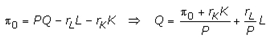 Объем выпуска, максимизирующий прибыль, зависит от технологических и экономических условий функционирования фирмы. Первые отображаются кривой общего выпуска (см. рис. 1), а экономические условия можно представить линией равной прибыли или изопрофитой. Уравнение изопрофиты выводится из уравнения прибыли: