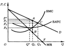 Чтобы побудить монополиста увеличить объем производства сверх Q1, необходимо установить предельную цену на еще более низком уровне. В частности, установление предельной цены на уровне P2 может побудить монополиста довести выпуск до Q2, каким он был бы в условиях совершенной конкуренции. При максимально допустимой цене P2 кривая предельных затрат пересечет эффективную кривую предельной выручки в точке С, где SMC = AR = Р. Заметим, что минимально возможный уровень предельной цены P3 = minSATC, при более низком ее уровне монополист не сможет возместить затраты на производство и в конечном счете покинет рынок.