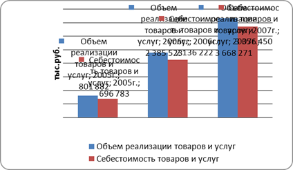 Как показывают данные таблицы 3, выручка от реализации товаров и услуг ООО «Рольф Восток» вырос за 2005-2007 гг. на 2866389 тыс. руб. или на 357,5%. Себестоимость товаров и услуг при этом выросла на 2659667 тыс. руб. или на 381,7% (рис.3). Опережающий темп роста себестоимости привел к тому, что затраты на один рубль объема реализации выросли на 4 коп. и составили в 2007 г. 91 коп. Это отрицательная тенденция.