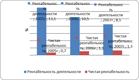 Показатели доходности компании изменились неоднозначно. Так, рентабельность деятельности упала с 13,1% в 2005 г. до 8,5% в 2007 г., чистая рентабельность при этом выросла с 0,7% в 2005 г. до 1,3% в 2007 г. (рис. 5).