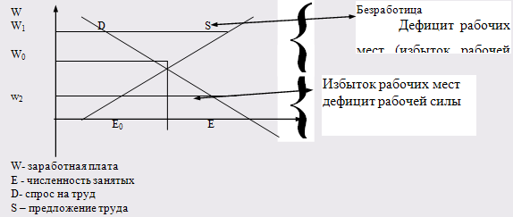 Из данной модели видно, что в точке пересечения D и S устанавливается равновесная цена за труд (заработная плата, W0) и определенный уровень занятости (Е0). В том случае, если уровень заработной платы по каким-то причинам повысится (с W0 до W1), то и величина предложения вырастет, так как на рынке появится дополнительное число лиц, ранее не соглашавшихся работать за зарплату W0. Однако, спрос на труд сократится в связи с тем, что для определенной части работодателей будет невыгодно нанимать рабочую силу из-за ее дороговизны. Результатом повышения заработной платы "сверх" равновесной цены станет увольнение части персонала, что приведет к росту безработицы, так как предложение рабочей силы превысит спрос на нее.