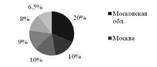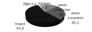 Рис. 1.3 Производство водки и ЛВИ по регионам России, в %