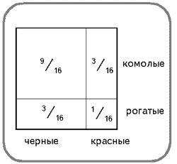 Изобразим это наглядно, отсекая нижнюю четверть квадрата горизонтальной линией (тогда меньший – нижний прямоугольник будет символизировать рогатую часть потомства). Независимо от этого, по признаку масти все потомство тоже должно распадаться на две неравные части: одна четверть – красные, а остальные три четверти – черные (ведь черный цвет доминирует).