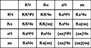 Составление решетки Пеннета. Этот прием хорошо знаком всем учителям, поэтому я не останавливаюсь на нем. Для нашей задачи таблица Пеннета будет выглядеть следующим образом (воспользуемся буквенной символикой второго способа записи условия).