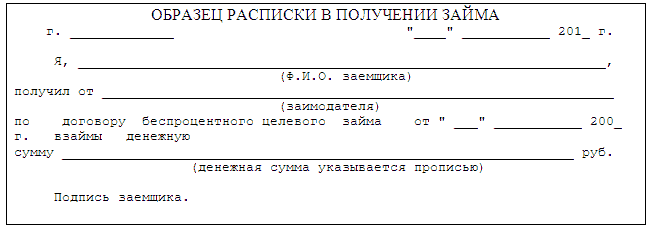 4.1. Пока заимодавец не передаст заемщику деньги, договор считается незаключенным (абз. 2 п. 1 ст. 807 ГК РФ). Передача денег по договору беспроцентного целевого займа подтверждается первичными учетными документами (платежное поручение, расходный кассовый ордер). Заёмщик может представить дополнительно расписку в подтверждение получения займа по приведенному образцу (п. 2 ст. 808 ГК РФ):