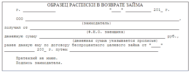 4.5. Срок возврата беспроцентного целевого займа или дата возврата должны быть предусмотрены в договоре очень взвешенно, так как для физического лица важно его целевое использование и избежание начисления НДФЛ по доходу в виде материальной выгоды, полученной от экономии на процентах за пользование заемными средствами при целевом использовании беспроцентного займа, в соответствии пп. 1 п. 1 ст. 212 НК РФ. По договору беспроцентного целевого займа в соответствии с пп. 3 п. 1 ст. 223 НК РФ дата фактического получения доходов в виде материальной выгоды определяется как соответствующие даты фактического возврата заемных средств. При возврате займа может быть оформлена расписка от организации следующего образца: