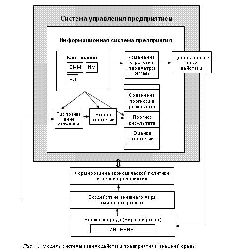 Наряду с традиционными этапами формализации модели экономической системы в качестве обязательного этапа создается и используется двусторонняя связь программы ЭММ и "банка знаний" предприятия, включающего в себя в числе прочих и банки данных, содержащих необходимую информацию. Сама ЭММ становится частью "банка знаний" предприятия, который, в свою очередь, входит в информационную систему (ИС), содержащую ту или иную и, как правило, не одну информационную модель (ИМ).