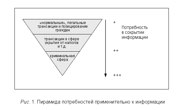 Бесспорно наличие аксиоматической отрицательной зависимости между количеством информации и качеством ее поиска - чем больше объем информации, тем сложнее найти достоверные данные. Количество требуемой информации для борьбы с преступностью и отмыванием денег находится в прямой взаимозависимости с нарушением частной сферы. Чем больше общественная потребность в информации, тем более контролирующие органы вынуждены вмешиваться в личную сферу граждан.