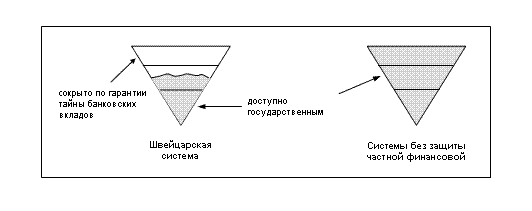 С первого взгляда может показаться, что швейцарская экономическая система покрывает незаконный бизнес и способствует отмыванию денег. Однако с точки зрения здравого смысла и при более детальном анализе становится очевидно, что это абсолютно не так. Финансовое и банковское право Швейцарии позволят охранять гарантию частных вложений и тем самым защищает банковских клиентов от вмешательства в частную сферу, предотвращая общественные посягательства на личные права человека. Вместе с тем право тайны банковских вкладов не распространяется на нижнюю часть "пирамиды", иначе говоря, криминальную сферу. К примеру, право банковской тайны не касается клиентуры, замеченной в налоговом обмане или любых иных преступных действиях вне зависимости от места их совершения.