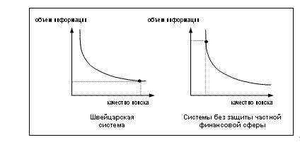 Эффективность управления и регулирования банковской индустрии во взаимодействии с законоконтролирующими органами зависит от тех ограничений и задач, которые ставятся в системе. В компромиссе между количеством информации и качеством поиска Швейцария оптимизирует последнее. Это делается в полном понимании того, что в ограничении поиска действительно криминальной сферы из виду упускаются тысячи, а может и сотни тысяч мелких правонарушений. Вопрос в том, насколько актуальна в этой ловле и борьбе с преступностью "мелкая рыбешка". К тому же система штрафных санкций и другие юридические меры вполне позволяют эффективно бороться с такими правонарушениями. Зависимость качества антикриминального регулирования от объема открытой информации можно изобразить графически, как это показано на рис. 3.